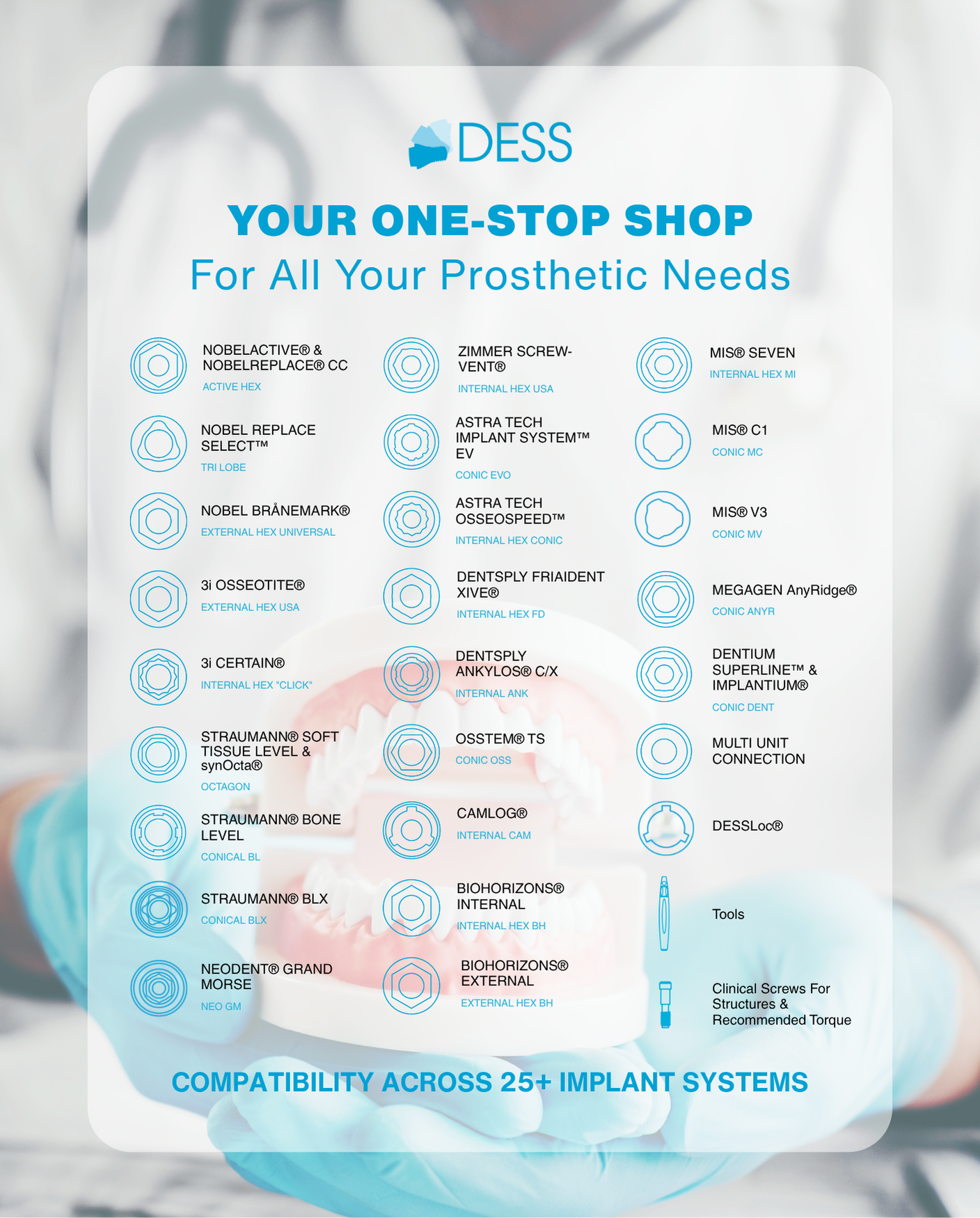 Another advantage DSOs appreciate is the peace of mind that comes with the DESS Lifetime Warranty. Every restorative component is backed against manufacturing or material defects, and if a compatible implant manufacturer refuses its own warranty because a DESS component was used, DESS covers the replacement cost of the implant.